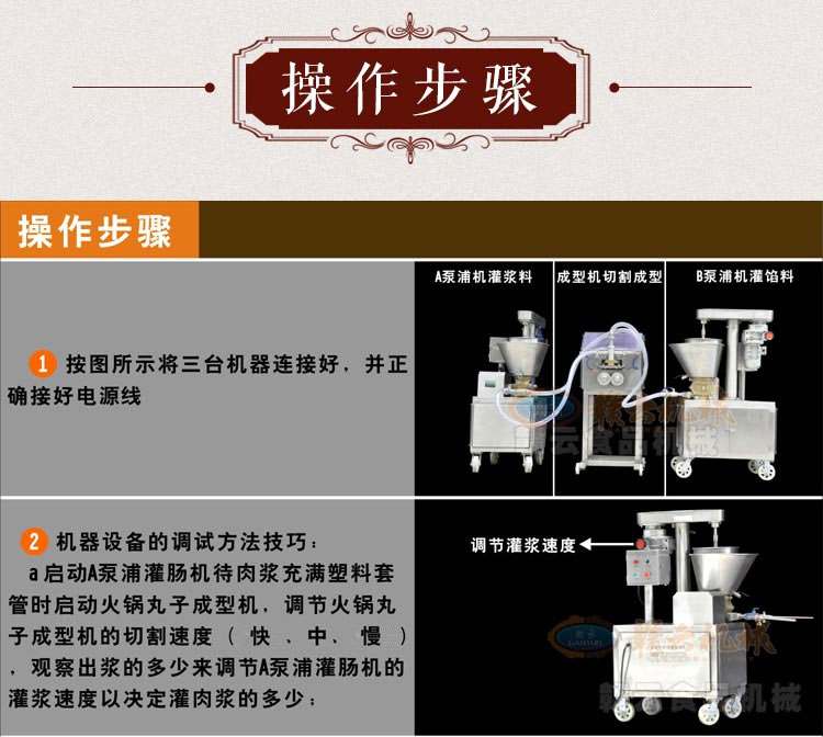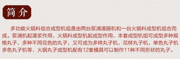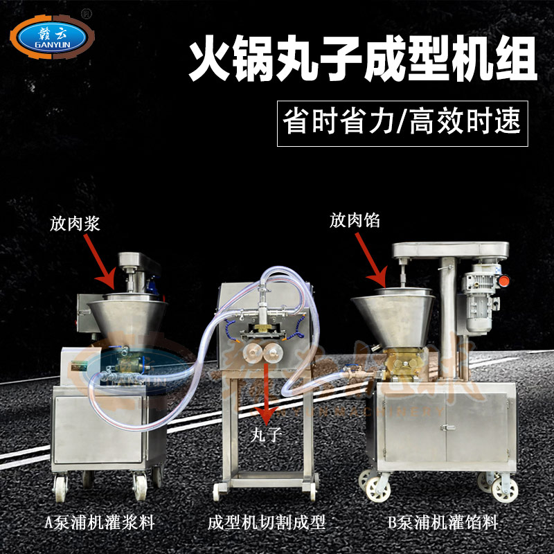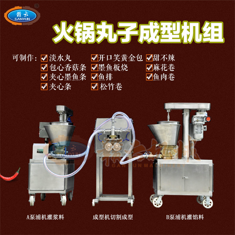 多功能火鍋料組合成型機組是由兩臺泵浦機和一臺火鍋料成型機組合而成,泵浦機起灌漿作用,火鍋料成型機起成型作用,本套成型機組可成型多種規(guī)格丸子,多種不同花色的丸子,又可稱為多樣丸子機,花樣丸子機,單色丸子機,多色丸子機等等。