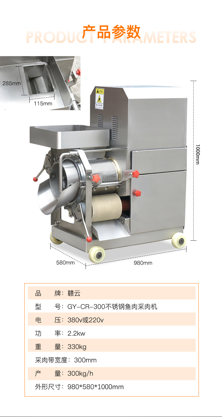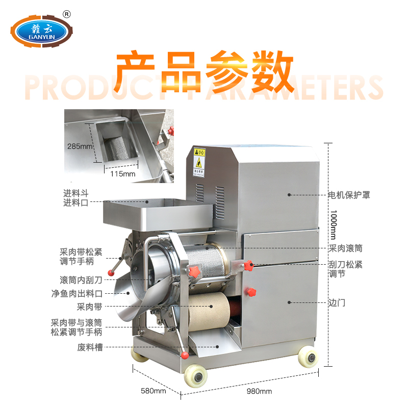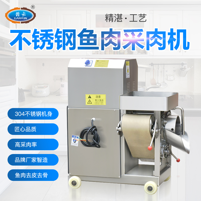 贛云系列不銹鋼300型魚肉采肉機(jī)又稱為去魚骨機(jī),采用擠壓原理將魚肉跟魚皮和魚骨分離開(kāi)來(lái),達(dá)到采魚肉的作用,這樣分離出來(lái)的魚肉含魚骨較少,還含有少量的魚筋、魚血等雜物,一般可使用魚糜精濾機(jī)過(guò)濾一遍,可使魚肉色純,魚肉更細(xì)膩,生產(chǎn)高品質(zhì)魚糜制品。
