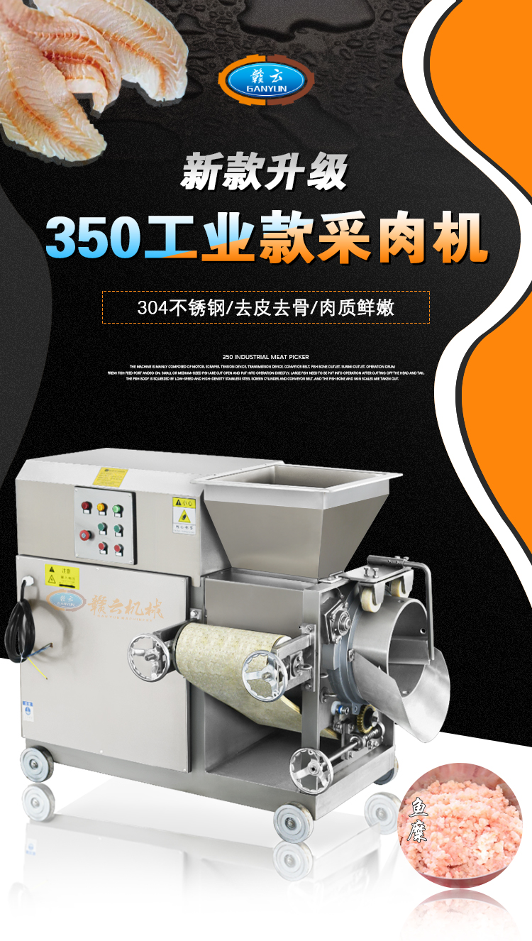 贛云牌新款350型魚肉采取機新品上市,采用全304不銹鋼材質(zhì),整體設計高端大氣,結構牢固。性能穩(wěn)定,可時產(chǎn)達2噸,魚肉采取干凈無魚刺,可直接用于魚糜深加工,做成各種高品質(zhì)魚丸、魚餅、魚排、魚脯等,這款采肉機除了可采取魚肉、蝦肉、蟹肉、泥鰍肉等,還可用于其他水產(chǎn)魚類的采肉工作。