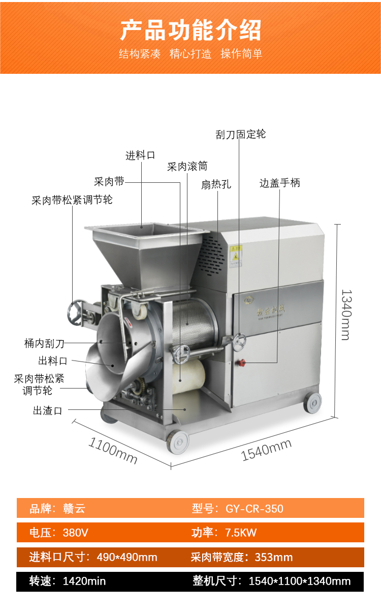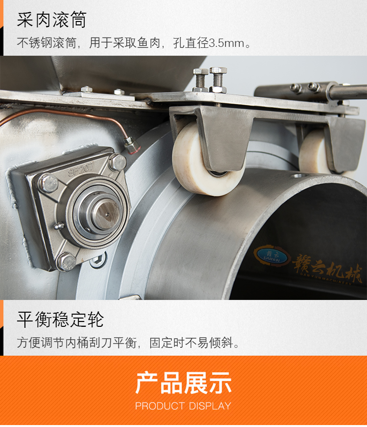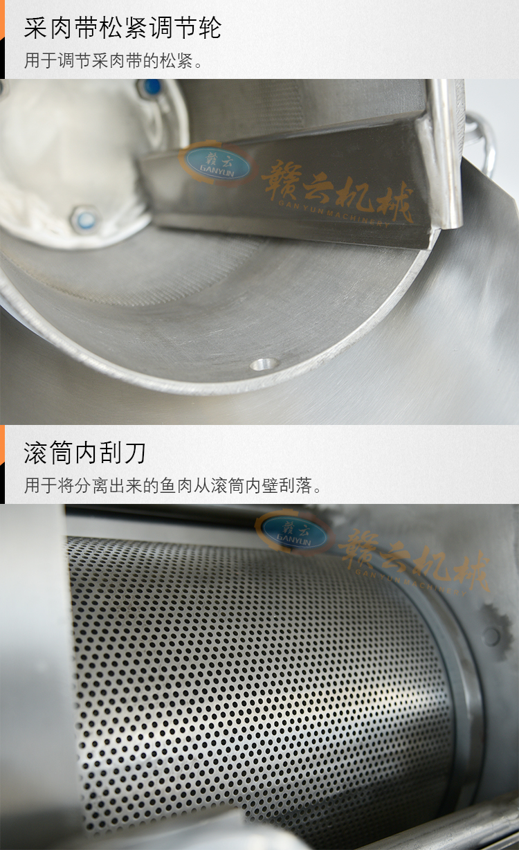 贛云牌350型魚肉采肉機采用全304不銹鋼,整體結構設計高端大氣,牢固耐用,性能穩(wěn)定,各種調(diào)節(jié)裝置設計合理,人性化操作程度高,增加了潤滑軸承的功能。以下是這款機器的結構示意圖和實物拍攝細節(jié)圖等。