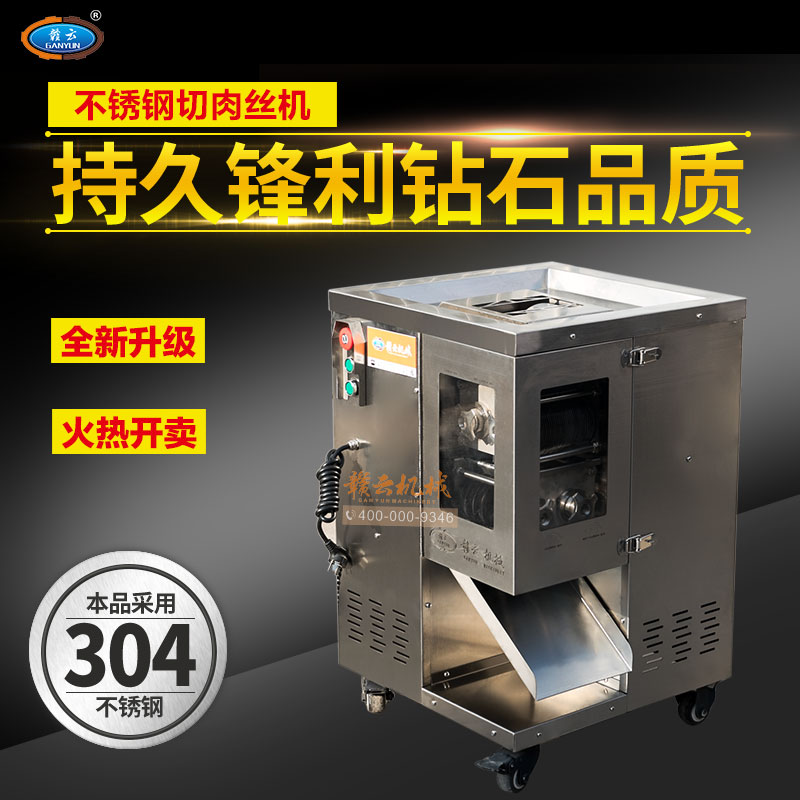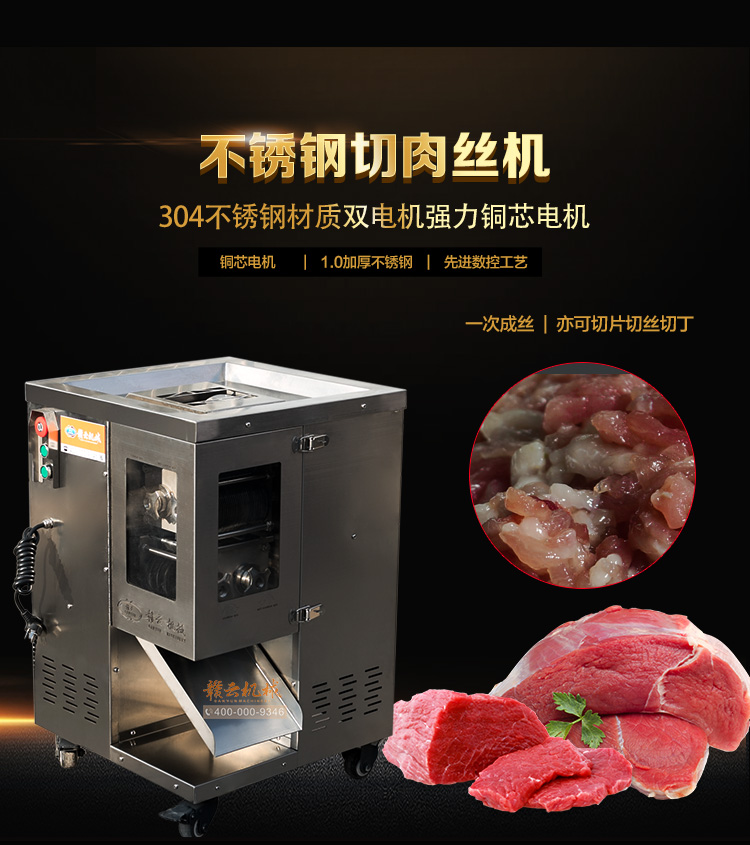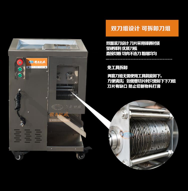 整機(jī)采用304不銹鋼板材封裝設(shè)計(jì),板材標(biāo)準(zhǔn)1mm厚,刀片采用特質(zhì)材質(zhì)雙滾切刀,鋒利耐用,雙電機(jī)分別控制垂直刀組切割肉類,可一次成絲,可免工具拆卸清洗刀組,切肉速度快,力度強(qiáng),切絲規(guī)格均勻