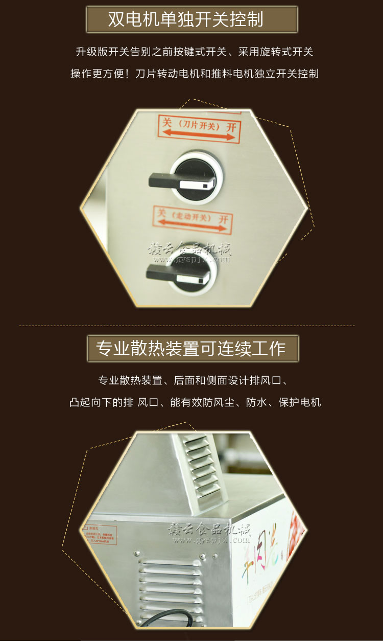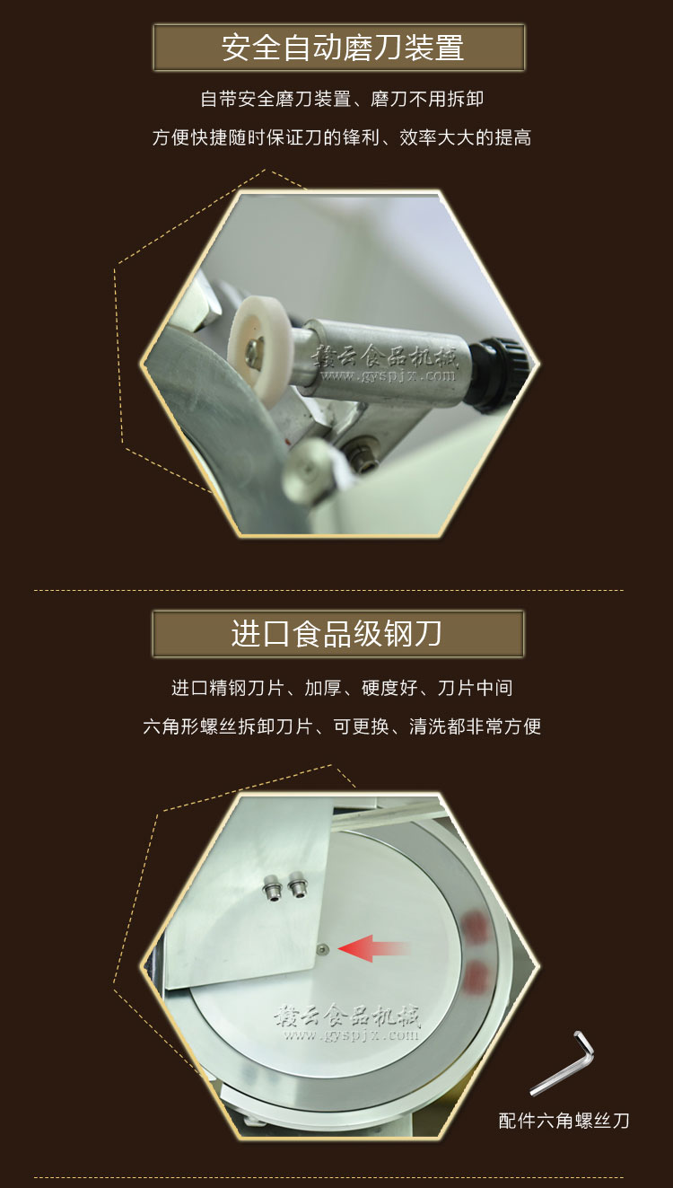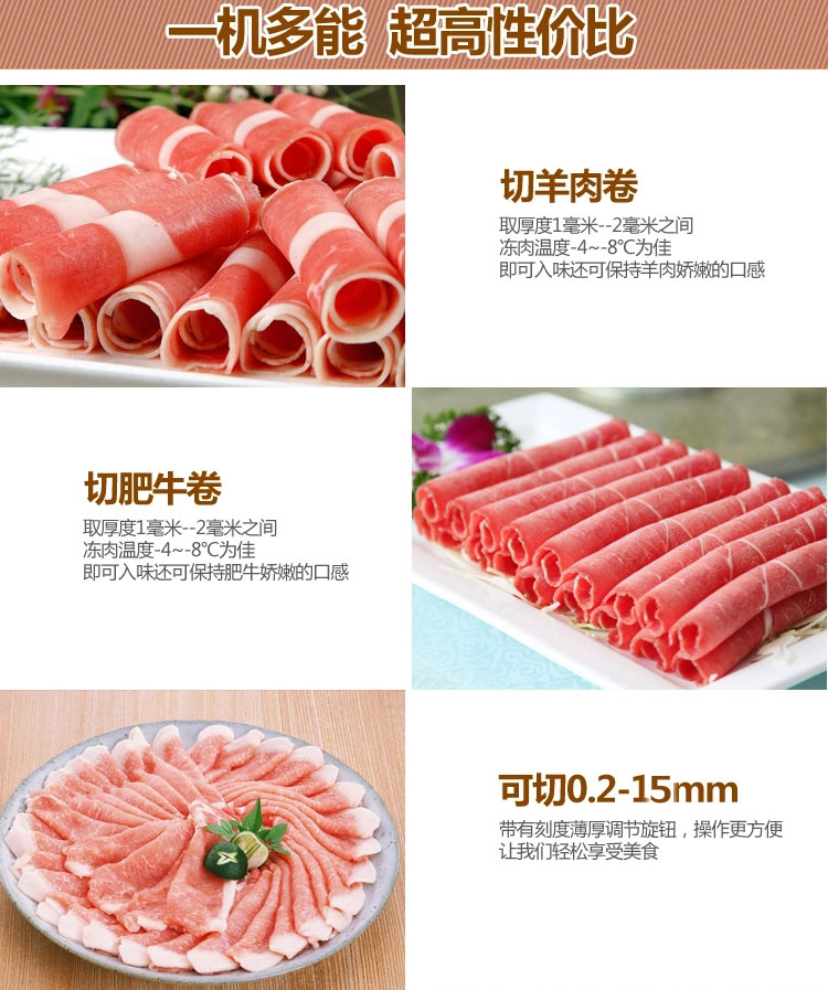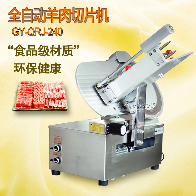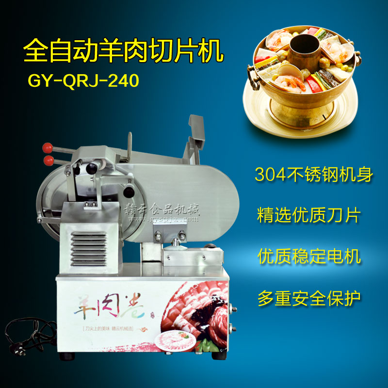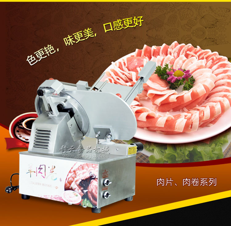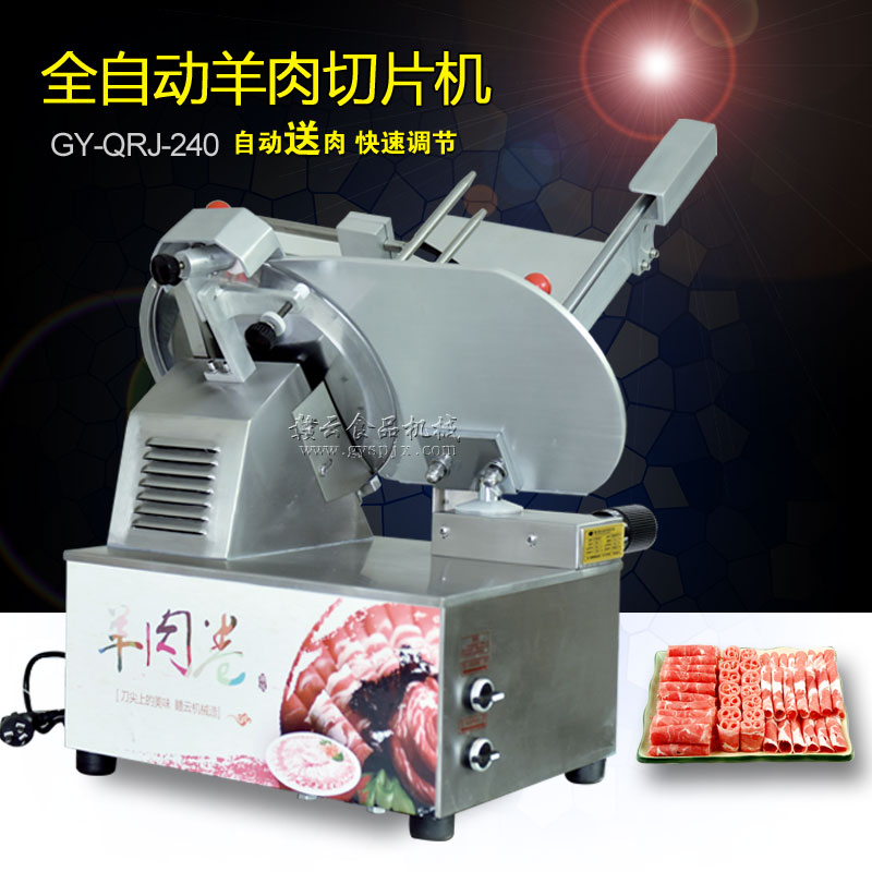 贛云牌全自動羊肉切片機(jī)采用加硬不銹鋼刀片,有效的保證了切割效率,切片厚薄可調(diào)0-15mm,可切零度以下凍肉,是凍羊肉、牛肉、豬肉切片,切卷利器;該機(jī)采用雙電機(jī)分別控制切肉刀轉(zhuǎn)動和推料走動,切肉刀轉(zhuǎn)動控制開關(guān)關(guān)閉狀態(tài)會自動切斷推料走動電機(jī)電源,已確保操作人員的人身安全。整機(jī)設(shè)計科學(xué)合理、美觀大方、省時省力、安全高效,是火鍋店、酒店、西餐等加工羊肉卷信賴的設(shè)備。