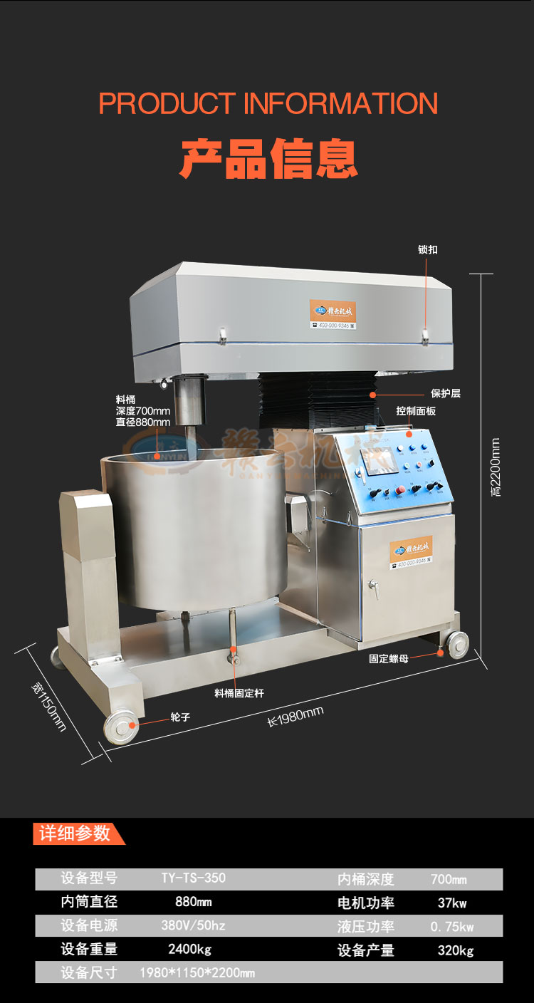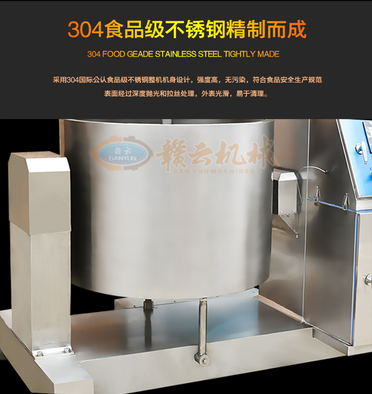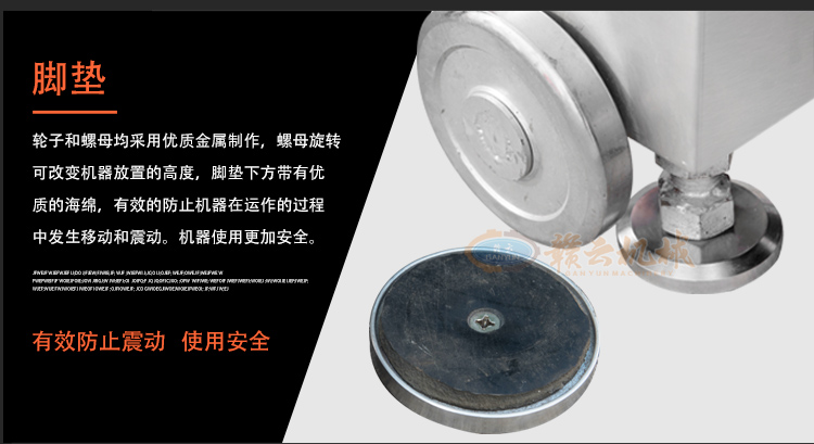接觸食物均為304不銹鋼及食用PP材料,料桶為304號(hào)不銹鋼,桶底為R30圓角方便衛(wèi)生清洗及不留死角。