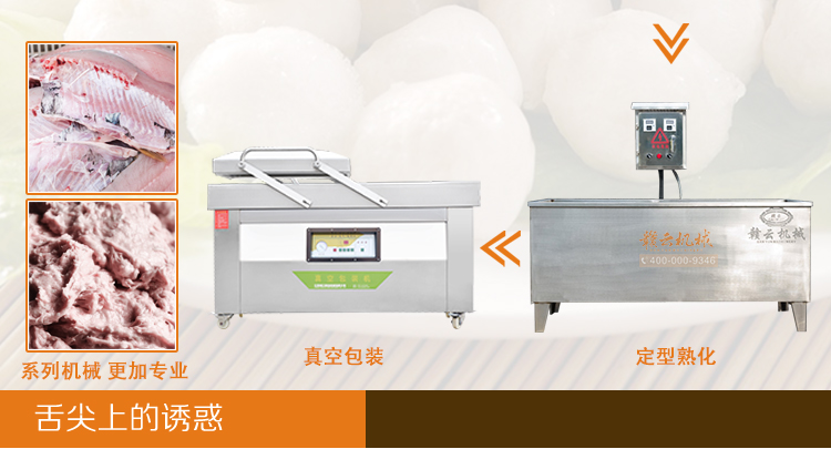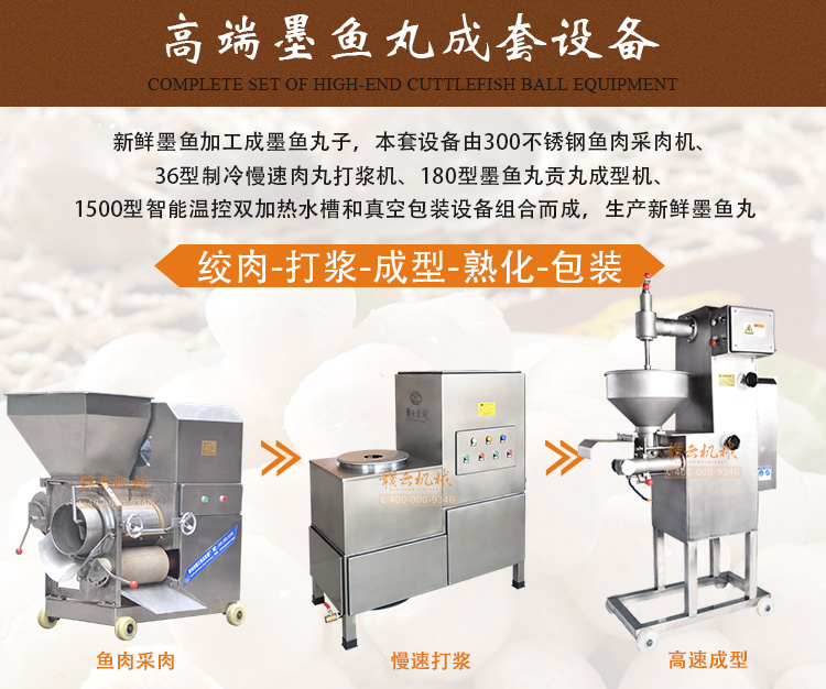 墨魚丸成套,新鮮墨魚加工成墨魚丸設備,墨魚丸機,本套設備由300不銹鋼魚肉采肉機、36型制冷慢速肉丸打漿機、180型墨魚丸貢丸成型機、1500型智能溫控雙加熱水槽和真空包裝設備組合而成,生產(chǎn)新鮮墨魚丸