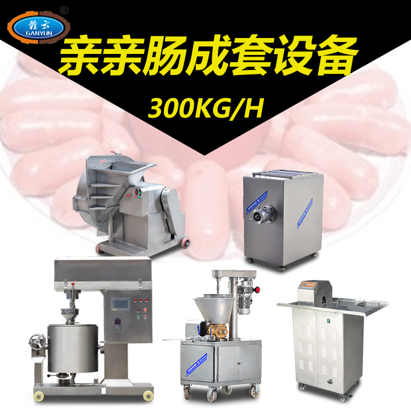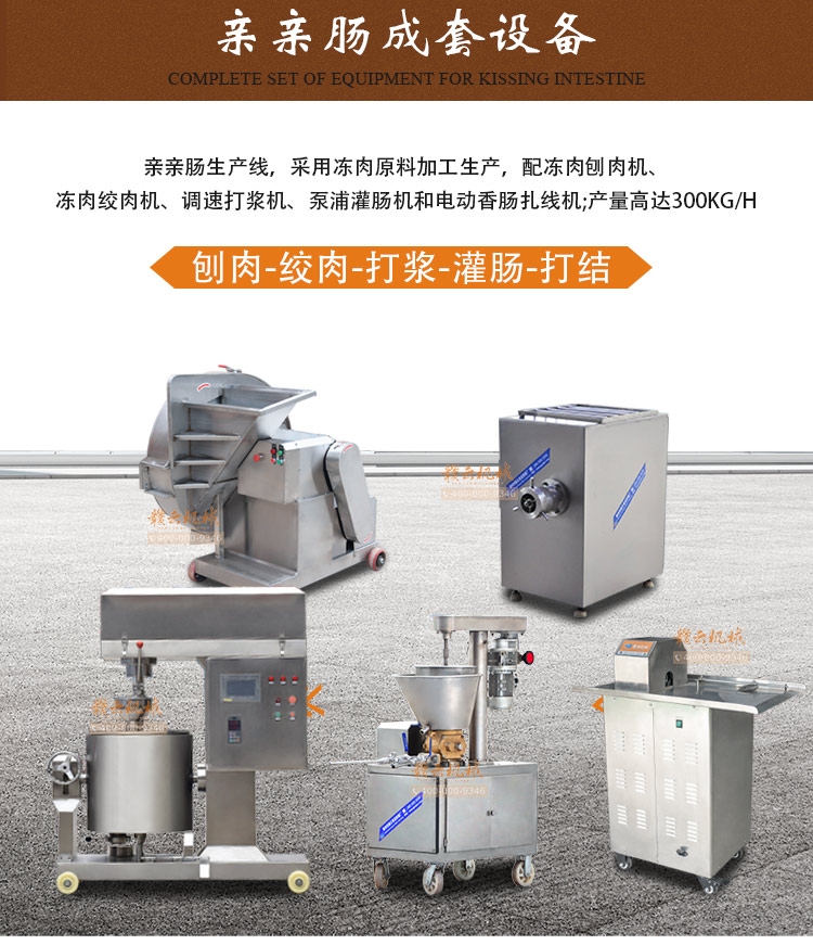 親親腸生產(chǎn)線,采用凍肉原料加工生產(chǎn),配凍肉刨肉機(jī)、凍肉絞肉機(jī)、調(diào)速打漿機(jī)、泵浦灌腸機(jī)和電動香腸扎線機(jī)。