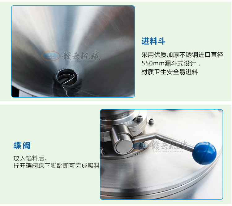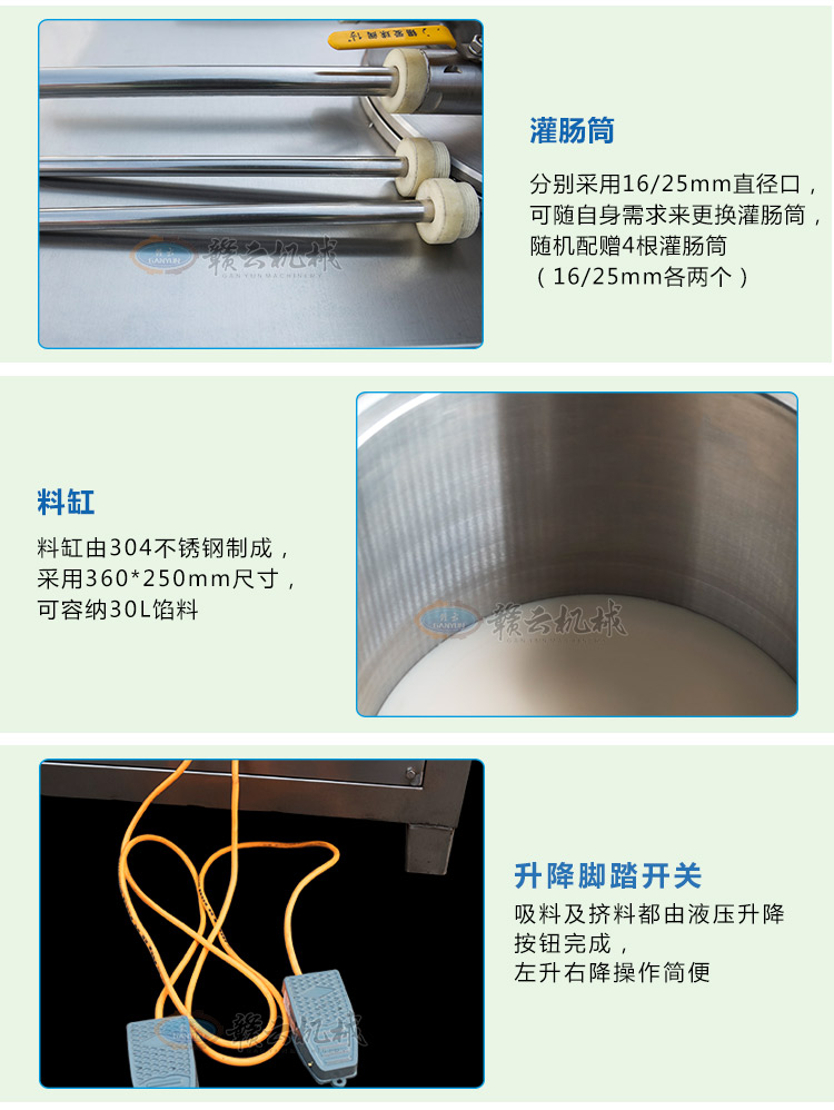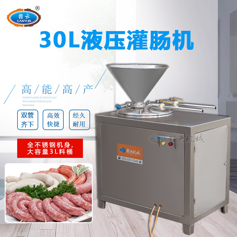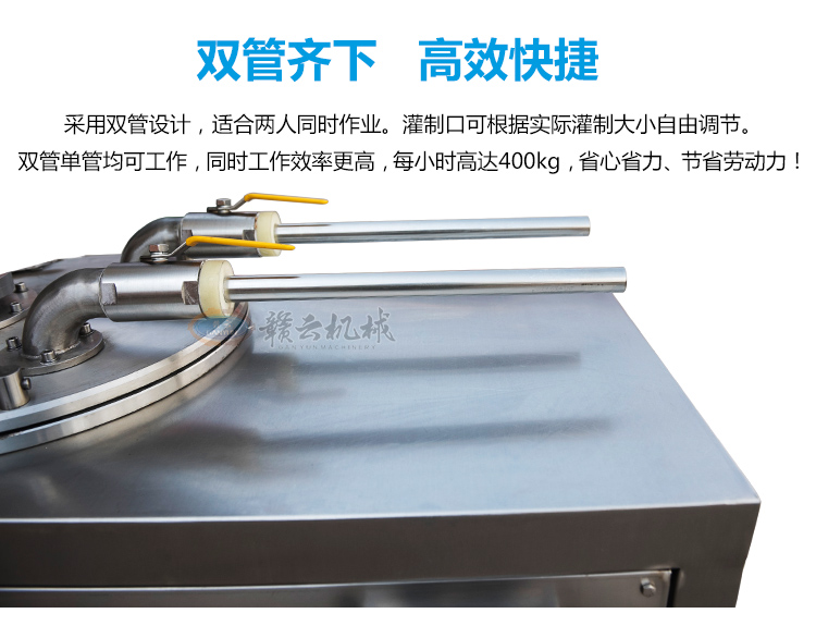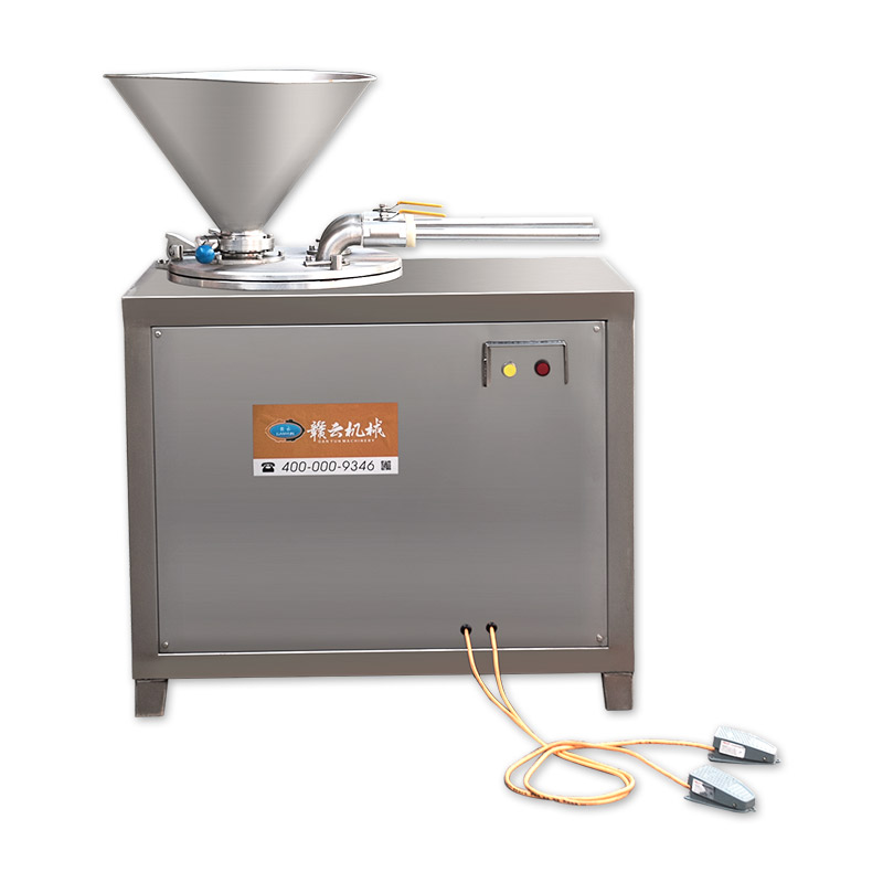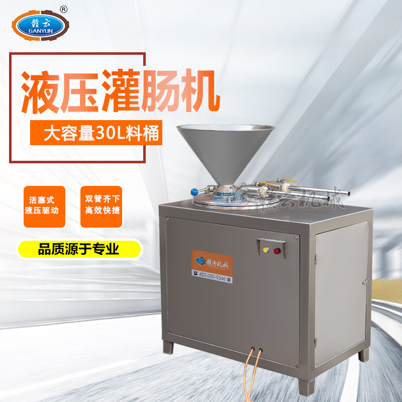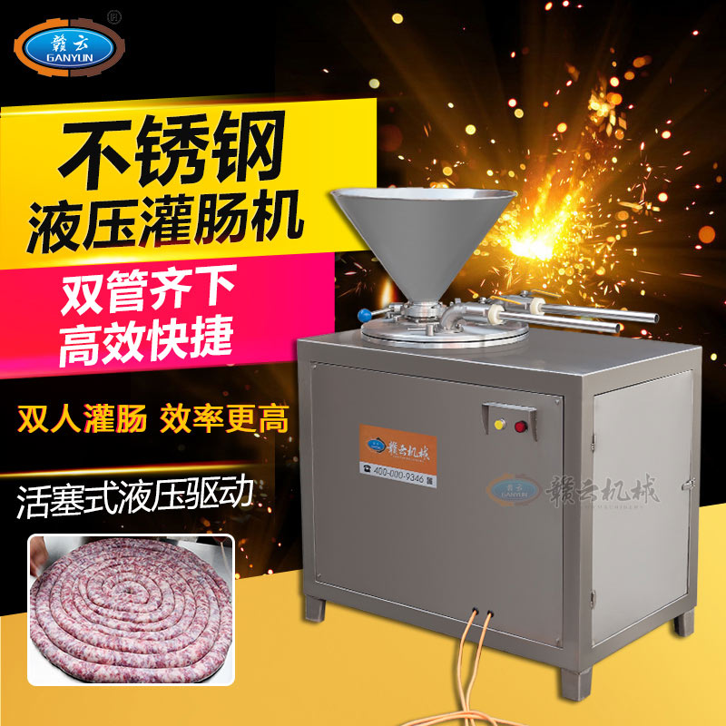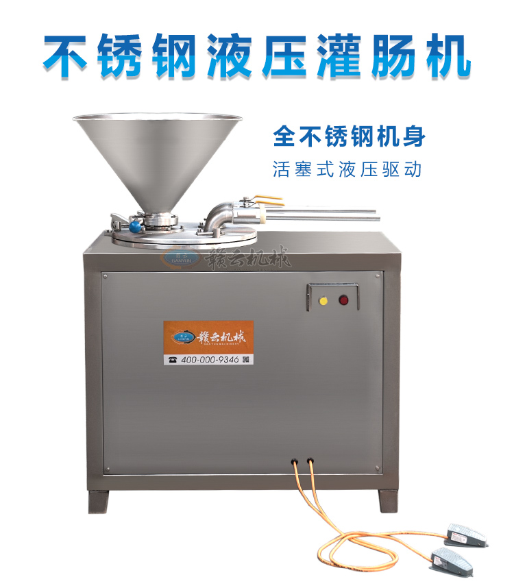 贛云液壓灌腸機(jī),新款灌漿機(jī),雙管灌腸機(jī)采用液壓灌漿推料原理設(shè)計(jì),密封性能良好,配合雙管灌漿,可自動調(diào)節(jié)灌漿,自動吸料,腳踏開關(guān)控制操縱自如。是腸類灌腸設(shè)備。