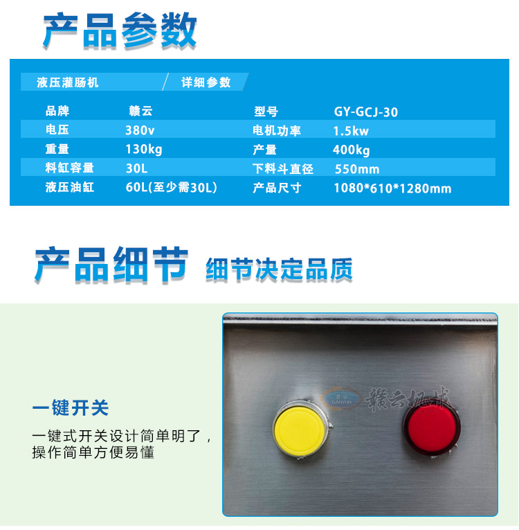 贛云食品機(jī)械旗下液壓灌腸機(jī),新款灌漿制腸,此款雙管灌腸機(jī)采用液壓灌漿推料原理設(shè)計(jì),設(shè)備密封性能良好,配合雙管灌漿提高灌腸產(chǎn)量,設(shè)備可自動調(diào)節(jié)灌漿,自動吸料,腳踏開關(guān)控制讓人操縱自如。是一款實(shí)用的灌漿制腸設(shè)備。 注意事項(xiàng):首次使用前必須加入一桶16KG的46#液壓油