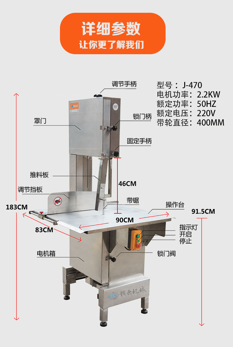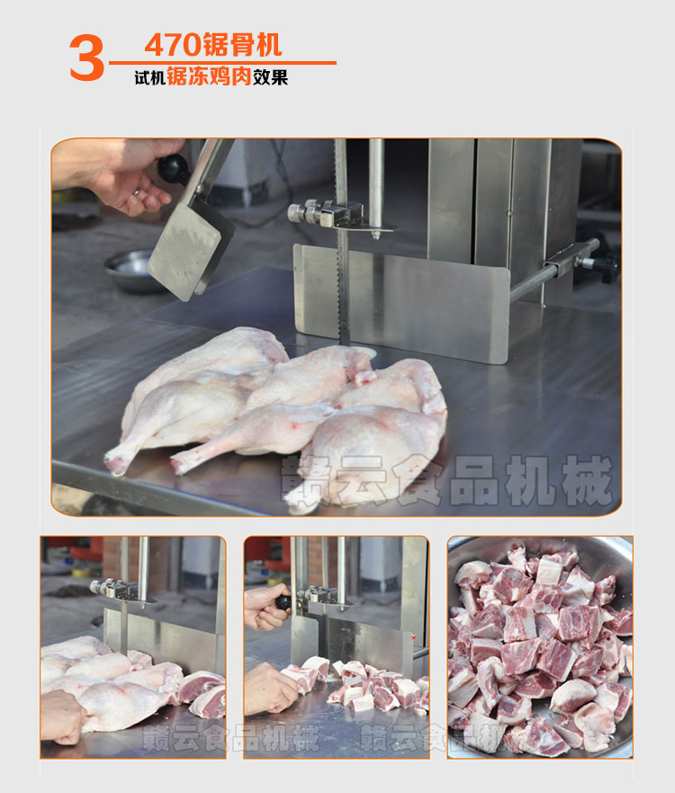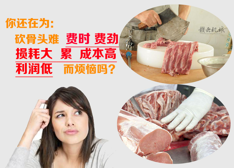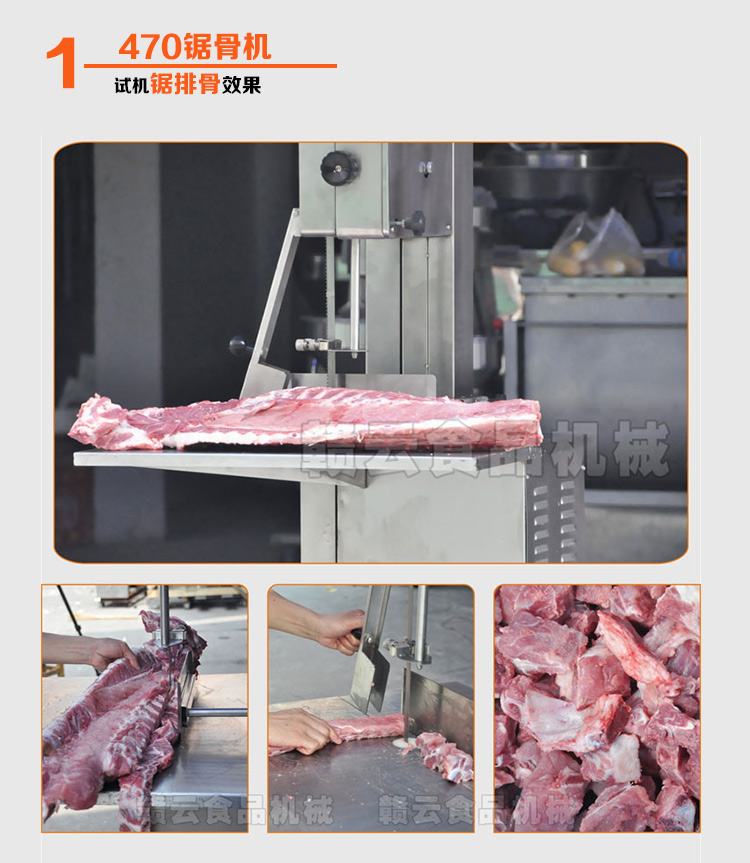 你還在為:砍骨頭難,砍骨頭累,費時,費勁,損耗大,成本高,利潤低而煩惱嗎?贛云牌商用鋸骨機,骨頭、凍魚、凍肉、家禽、牛羊等切割專家,專切硬骨頭,470型商用鋸骨頭機,切割速度快,切割效率高,切割面平整,損耗低,能耗低,操作方便快捷,深受骨類加工商戶青睞。