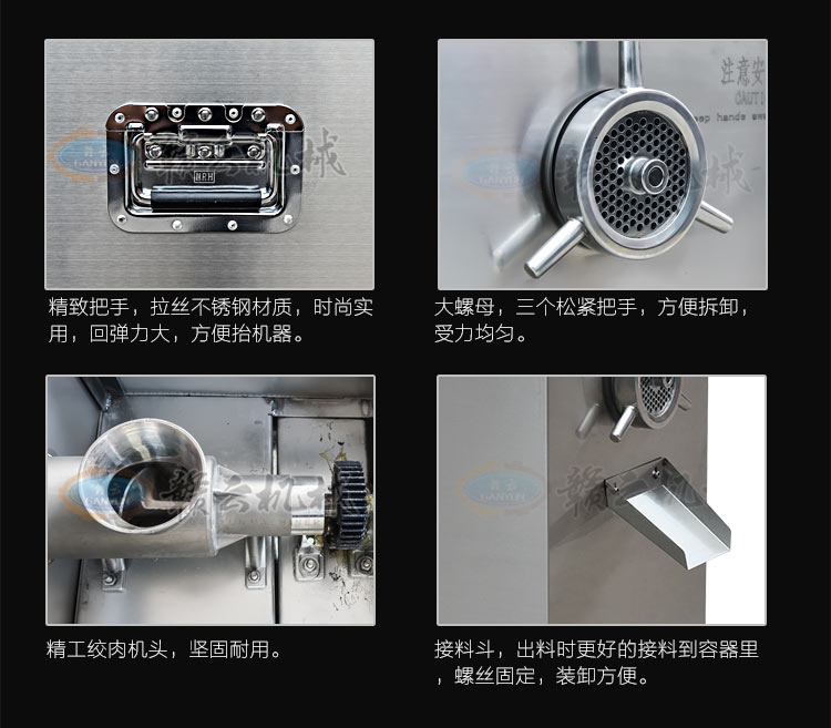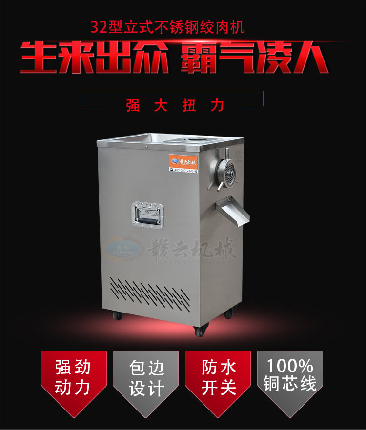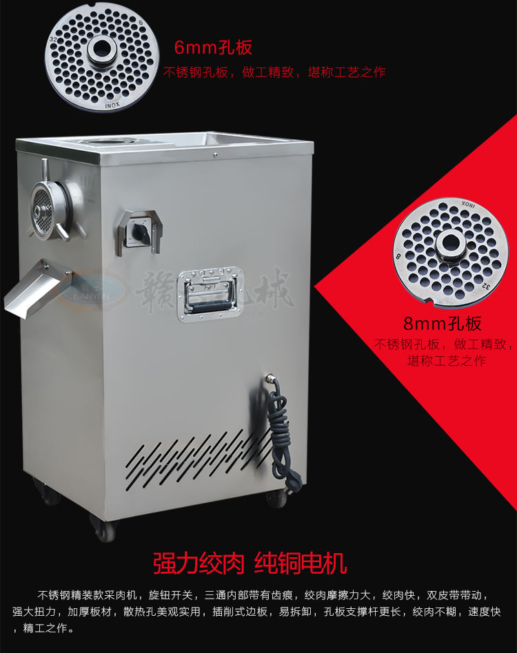 32型立式不銹鋼絞肉機(jī)(新),不銹鋼精裝款采肉機(jī),旋鈕開關(guān),三通內(nèi)部帶有齒痕,絞肉摩擦力大,絞肉快,雙皮帶帶動(dòng),強(qiáng)大扭力,加厚板材,散熱孔美觀實(shí)用,插銷式邊板支撐桿更長,絞肉不糊,速度快,精工之作。