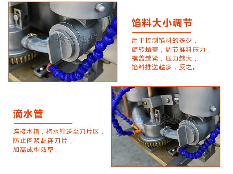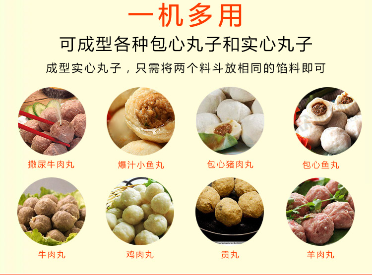 一機(jī)多用,可成型各種包心丸子和實心丸子,成型實心丸子,只需要將兩個料斗放相同的餡料即可,是一款實用的肉丸機(jī)。