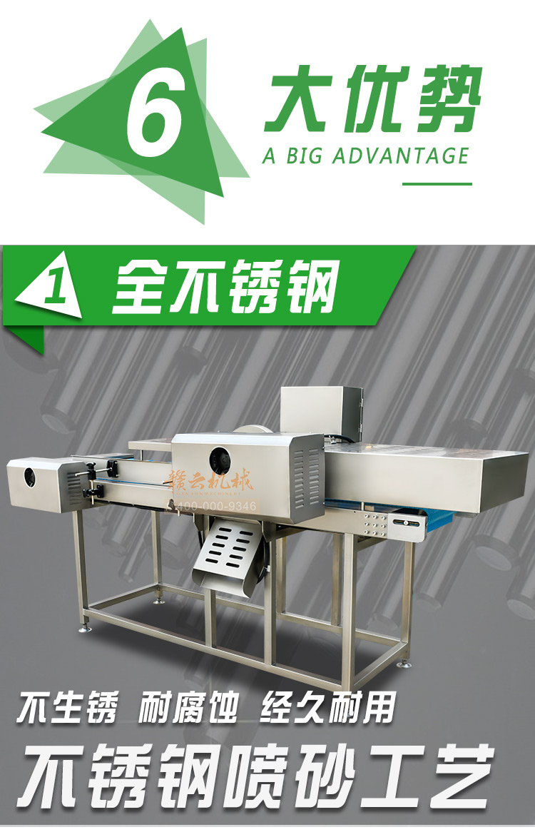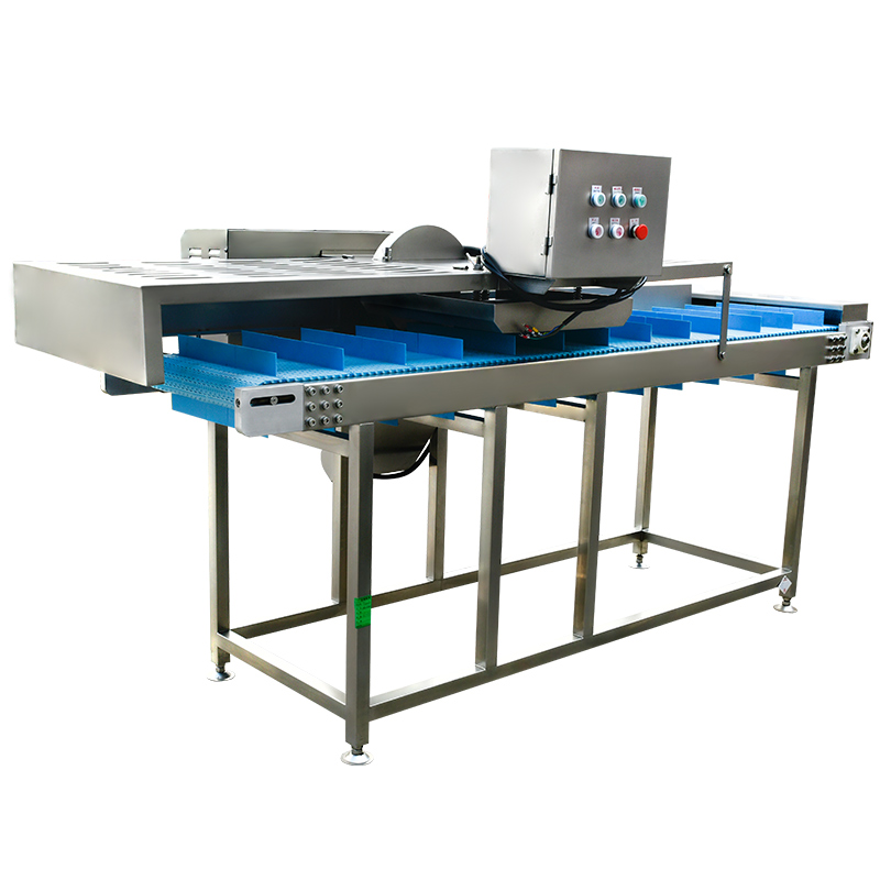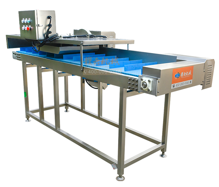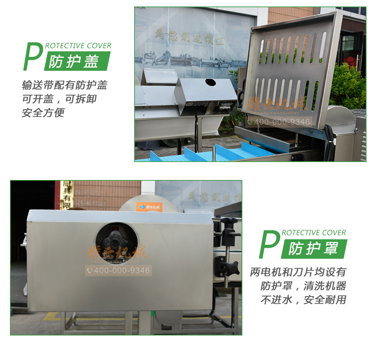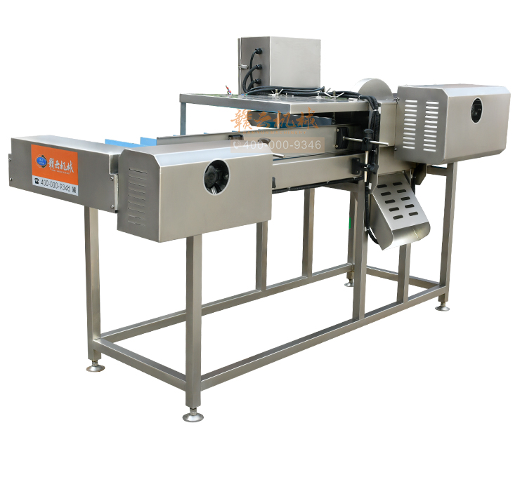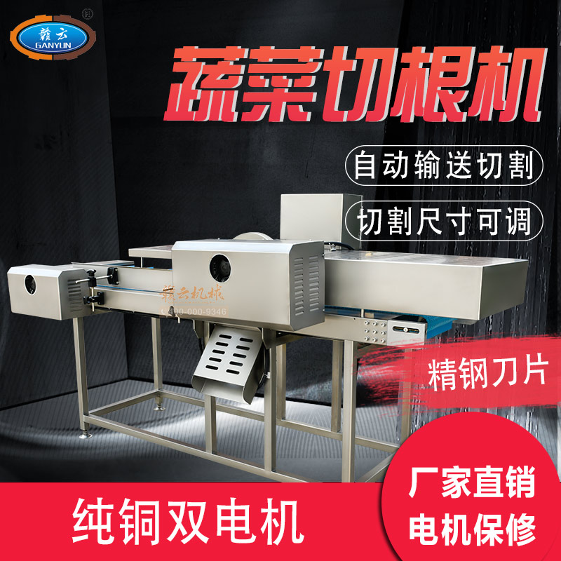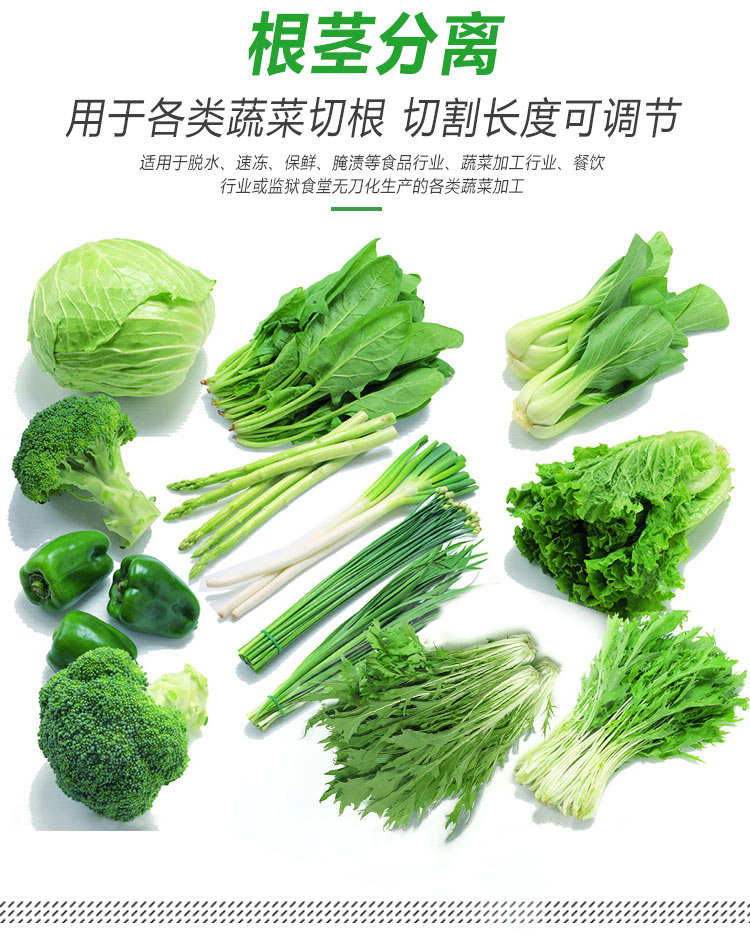 平行輸送去根機由輸送板帶動物料前行,蔬菜經過固定位置的刀盤后,蔬菜根部被切割從廢料口出來,保留的蔬菜則向前輸送。切割的長度可以調節,每顆蔬菜所切割出來的廢料都相等。去根機適合大型食品加工廠、凈菜生產線等。