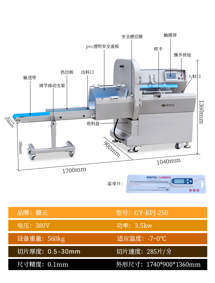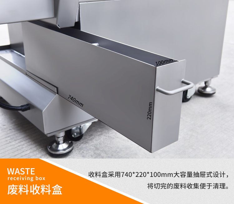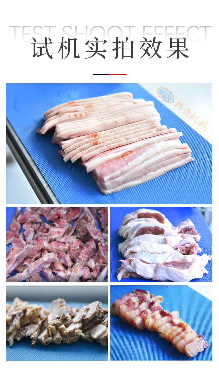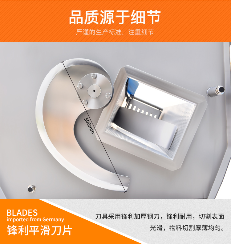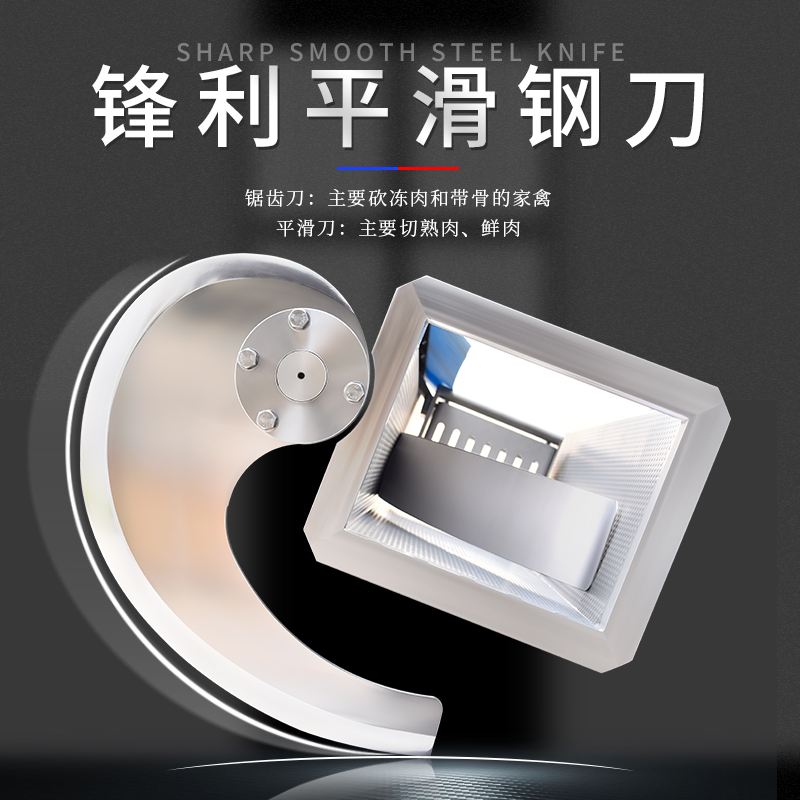 機器采用鋒利加厚鋼刀,鋒利耐用,平滑刀主要用于切熟肉和鮮肉,鋸齒刀主要用于砍凍肉和帶骨的家禽,機器默認配置平滑刀。機器采用手動和自動兩種切換模式,并且厚薄斷續(xù)可輕松調節(jié)。