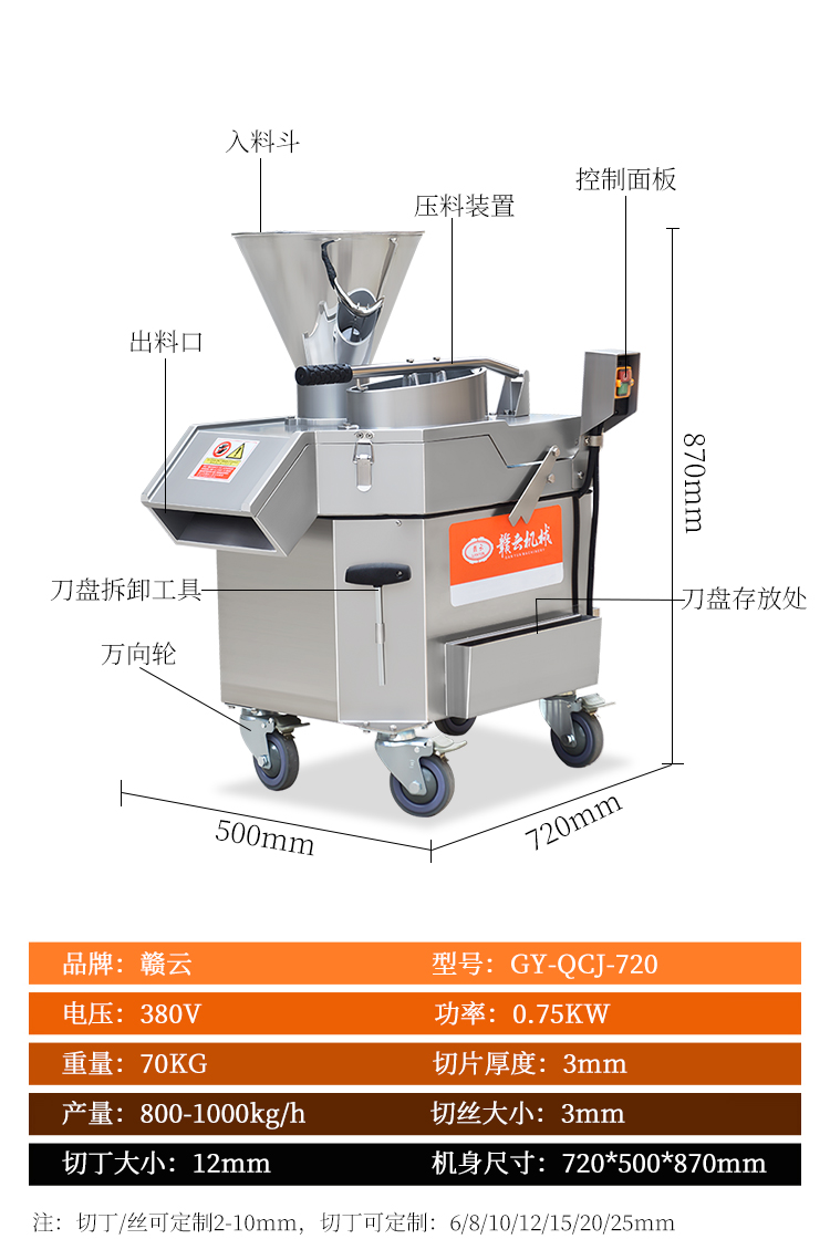 多功能切菜機(jī)廠家設(shè)備視頻展示,專(zhuān)業(yè)生產(chǎn)平行切菜機(jī),針對(duì)果蔬切片、切絲、切丁,設(shè)備產(chǎn)量高,速度快,一臺(tái)切菜機(jī)可代替多名人工切菜,省時(shí)省人工,切菜機(jī)的操作方法簡(jiǎn)單。歡迎前來(lái)咨詢(xún)贛云機(jī)械