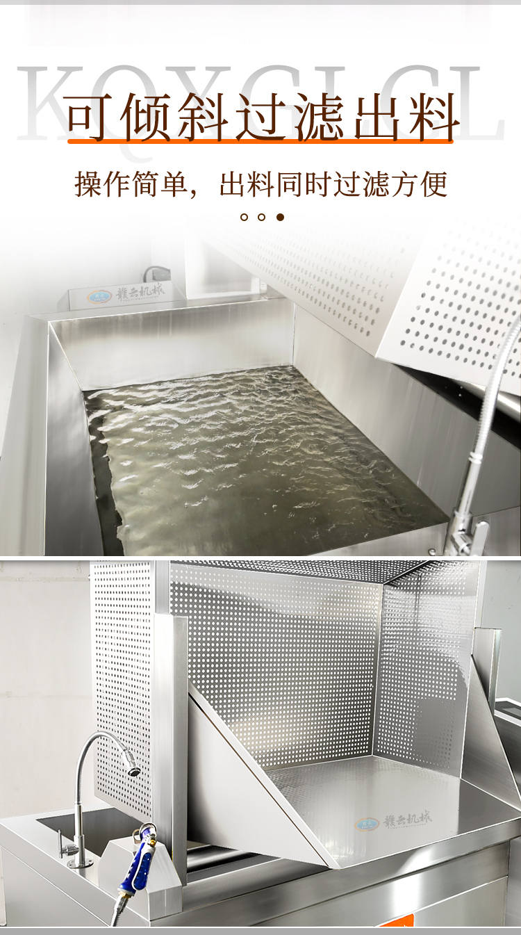 蔬菜漂燙機采用食品級不銹鋼材質(zhì)打造而成,擁有400L大容量鍋體,物料鍋體整體可翻轉(zhuǎn)方便出料,配備沖洗槍和萬向水龍頭,底部加熱使用加大聚能線圈,讓整體加熱更均勻,設(shè)計的防水智能控制面板可以操作精準(zhǔn)定時溫控、出料、自動濾水等,整體操作便捷,簡單易上手。