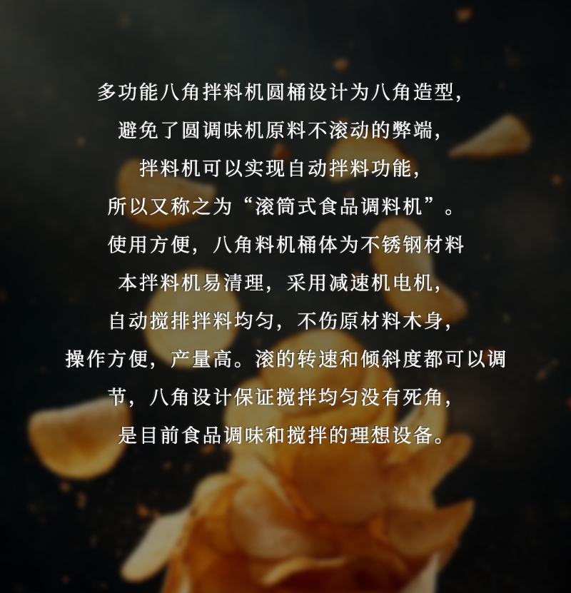 適用于堅(jiān)果、蠶豆、牛肉干、薯片、花生、月亮巴、鍋巴等食品的快速均勻上料調(diào)味。