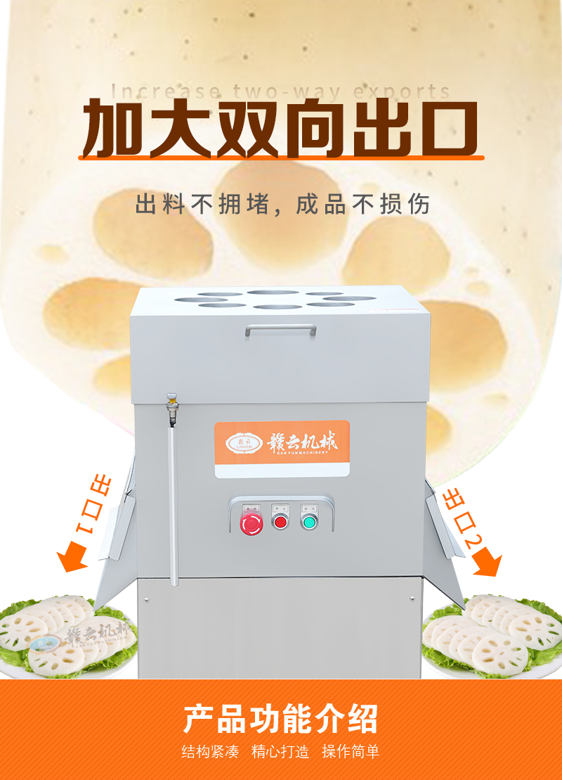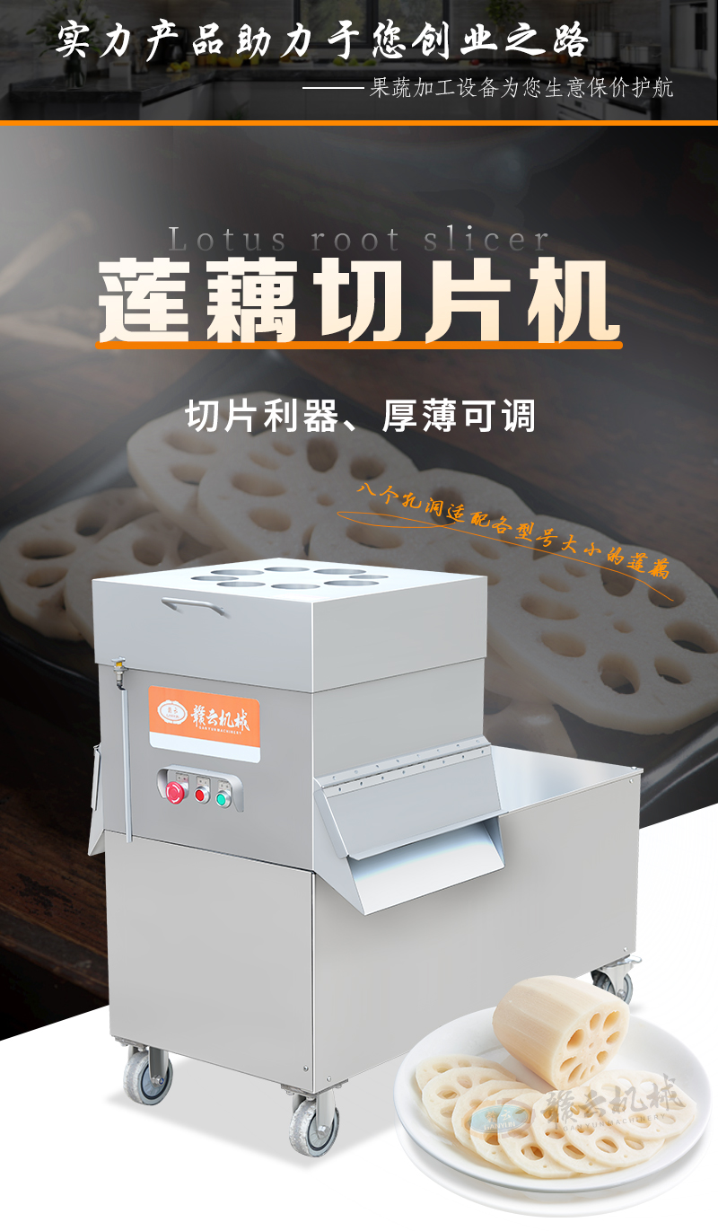 蓮藕切片機專為土豆、蓮藕、白蘿卜、檸檬、蘋果、胡蘿卜、西紅柿、獼猴桃等果蔬切片。采用下壓式設計,食品級不銹鋼材質(zhì),整體操作簡單,清洗方便,安全耐用。采用雙切刀進行切片,八孔入料設計,大大提升了切片效率。這款高效的蓮藕切片機,適用于商用廚房、中央廚房、營養(yǎng)餐供餐中心、食堂、食品廠等,幫助您快速完成各種水果或球根莖類蔬菜的快速切片加工。