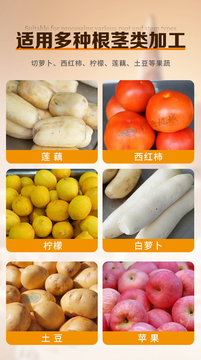 適用于:土豆、蓮藕、白蘿卜、檸檬、蘋果、胡蘿卜、西紅柿、獼猴桃等果蔬的快速切片。
