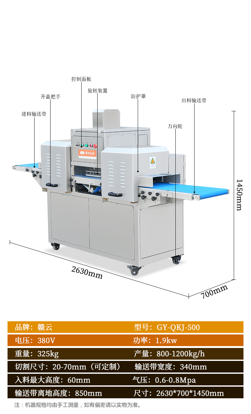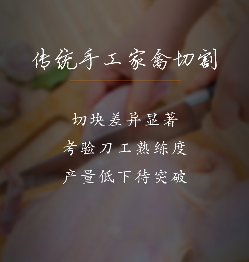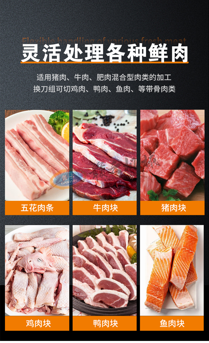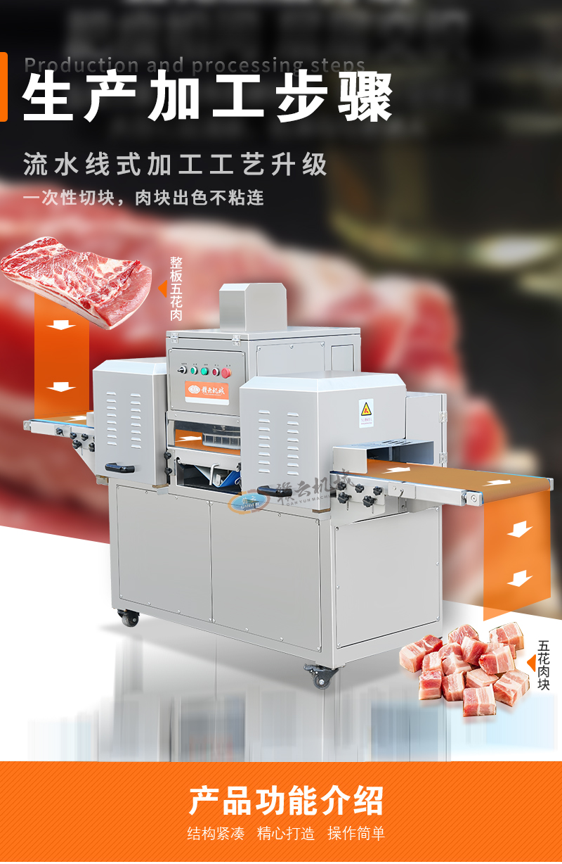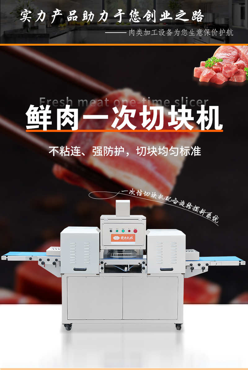 適用于:五花肉、牛肉、魚(yú)、雞、鴨等鮮肉和家禽的快速切塊,一次成塊。