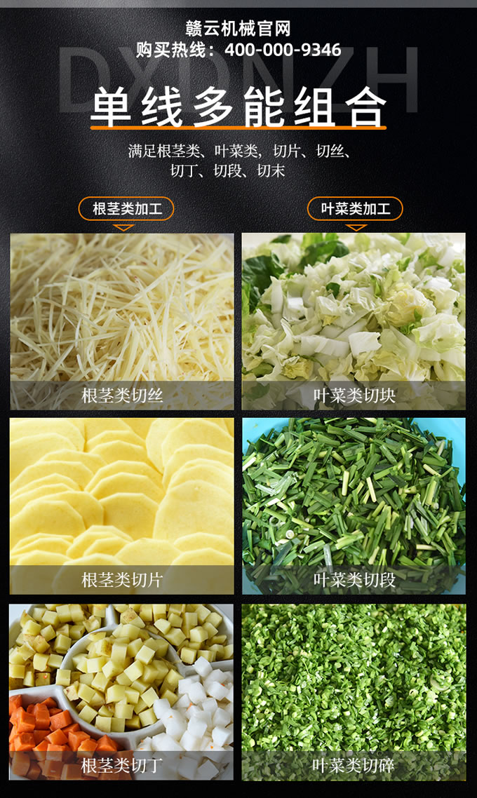 組成這條雙用凈菜加工流水線的主要設備包含:提升機、毛滾去皮清洗機、分選機、312切菜機(切片切絲切丁機)、六工位分選機、智能切菜機、輸送提升機、清洗提升機、一次渦流清洗機、一次震動過濾機、二次渦流清洗機、二次震動過濾機、震動風干機等設備組成。