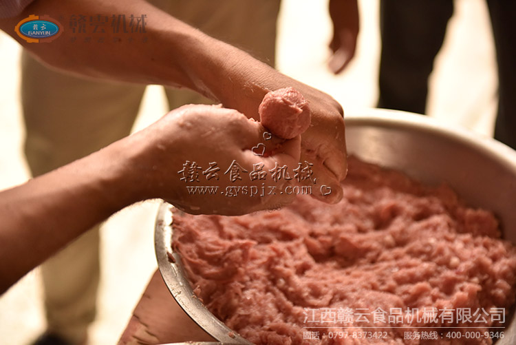 贛云工藝師嫻熟的手工成型包心牛肉丸技巧。