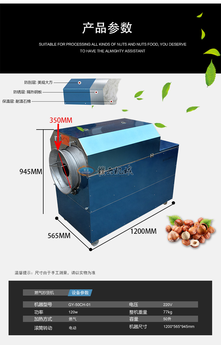 這臺炒貨機適合加工各種干果和堅果類,如板栗、花生、瓜子、松粒、杏仁、菜籽、咖啡豆、紅棗、芝麻、核桃、各種豆類、麥類、米類、藥材類。