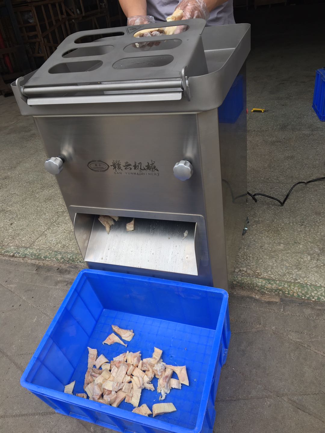 接通電源后就把拆開的快遞里面的牛板筋拿出來(lái)了,按下開關(guān)機(jī)器里面的刀組就飛快的旋轉(zhuǎn)起來(lái)了,把牛板筋橫著放進(jìn)行,馬上就從出料口出來(lái),中間過(guò)程干凈利索,沒(méi)有任何的停頓,因?yàn)檫@個(gè)客戶要求的尺寸比較大所以切割出來(lái)的效果稍微有點(diǎn)大,如果想切得更小些可以使用更緊密的刀組或者進(jìn)行第二遍切割即可。
