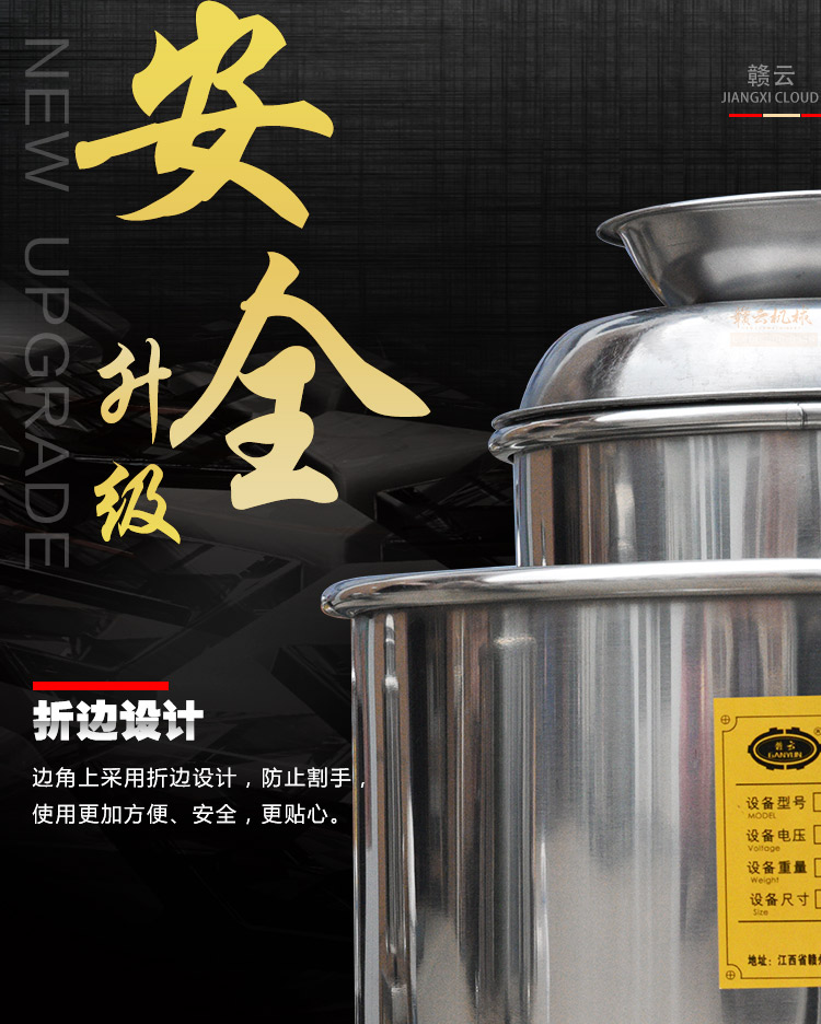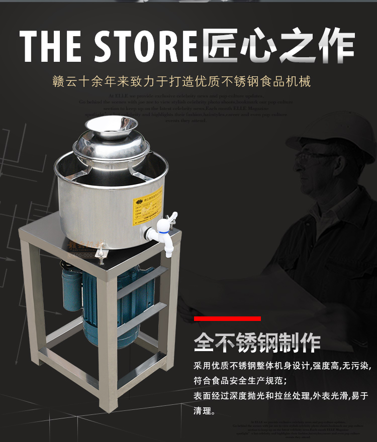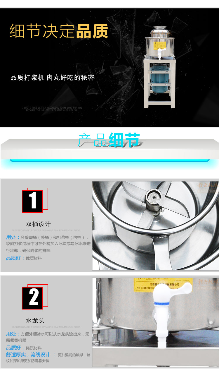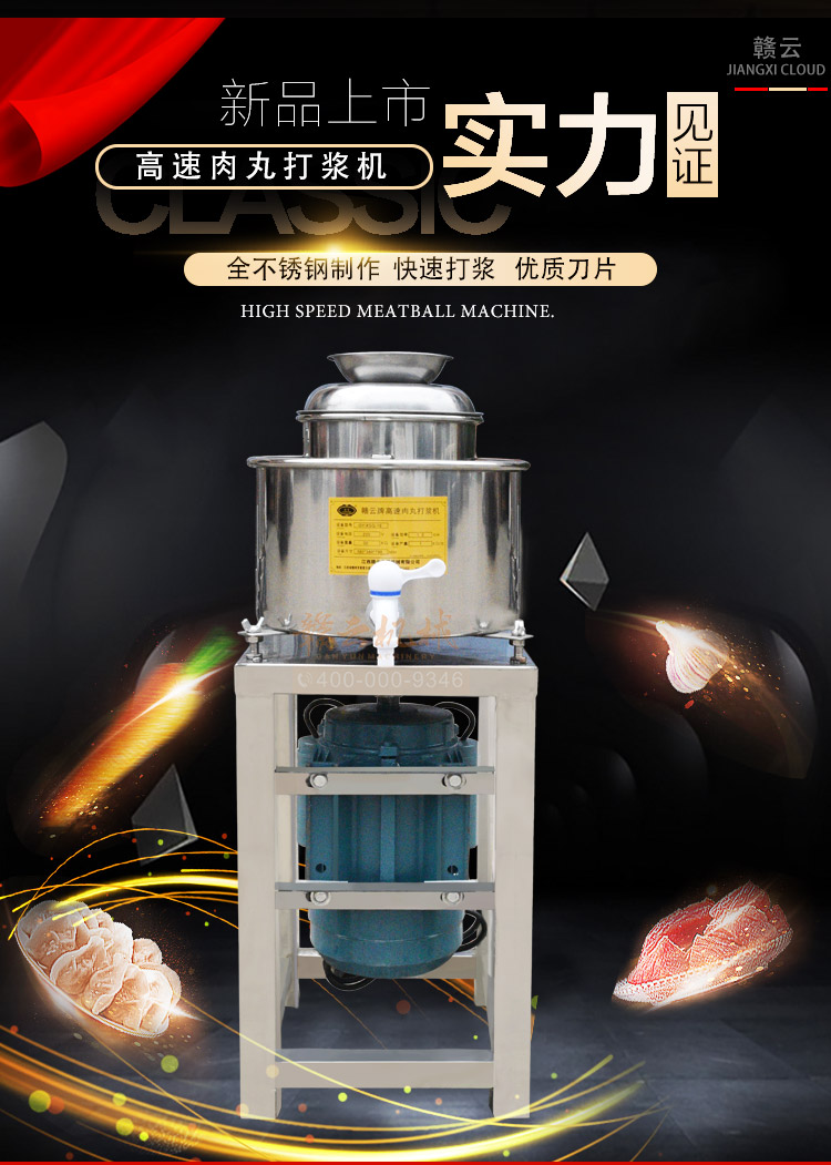 贛云牌新款全不銹鋼肉丸機(jī),18型肉丸機(jī)采用全不銹鋼材質(zhì),在舊款全不銹鋼肉丸機(jī)的基礎(chǔ)上給支撐架加粗加厚,用不銹鋼蓋,打漿雙桶,刀柄刀片均采用不銹鋼材質(zhì)。打漿桶裝肉量1L,一次可打肉漿1-2斤左右,采用2800r/min高速電機(jī),故稱之為高速肉丸機(jī)。